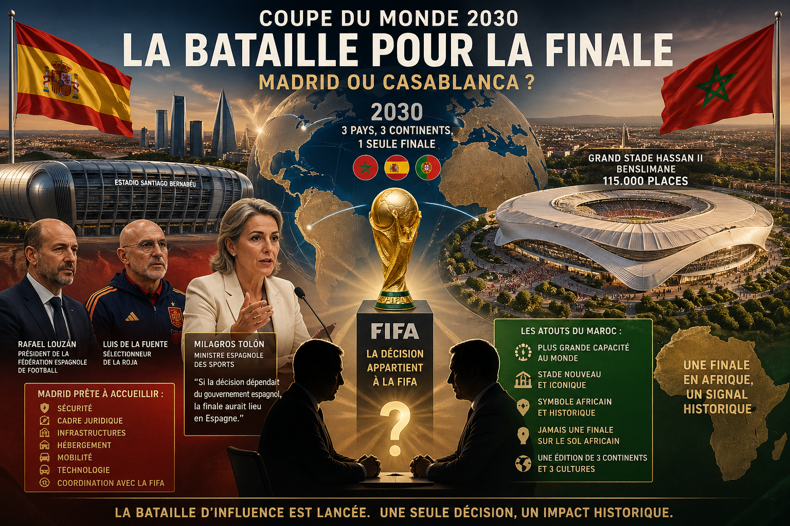 Mais face aux ambitions espagnoles, le Maroc dispose aussi d’arguments solides. Le futur Grand Stade Hassan II de Benslimane, près de Casablanca, avec une capacité annoncée de 115.000 places, s’impose progressivement comme un concurrent sérieux face au Santiago Bernabéu ou au Camp Nou. Sa dimension, son caractère inédit et sa symbolique africaine pourraient jouer en faveur du Royaume.