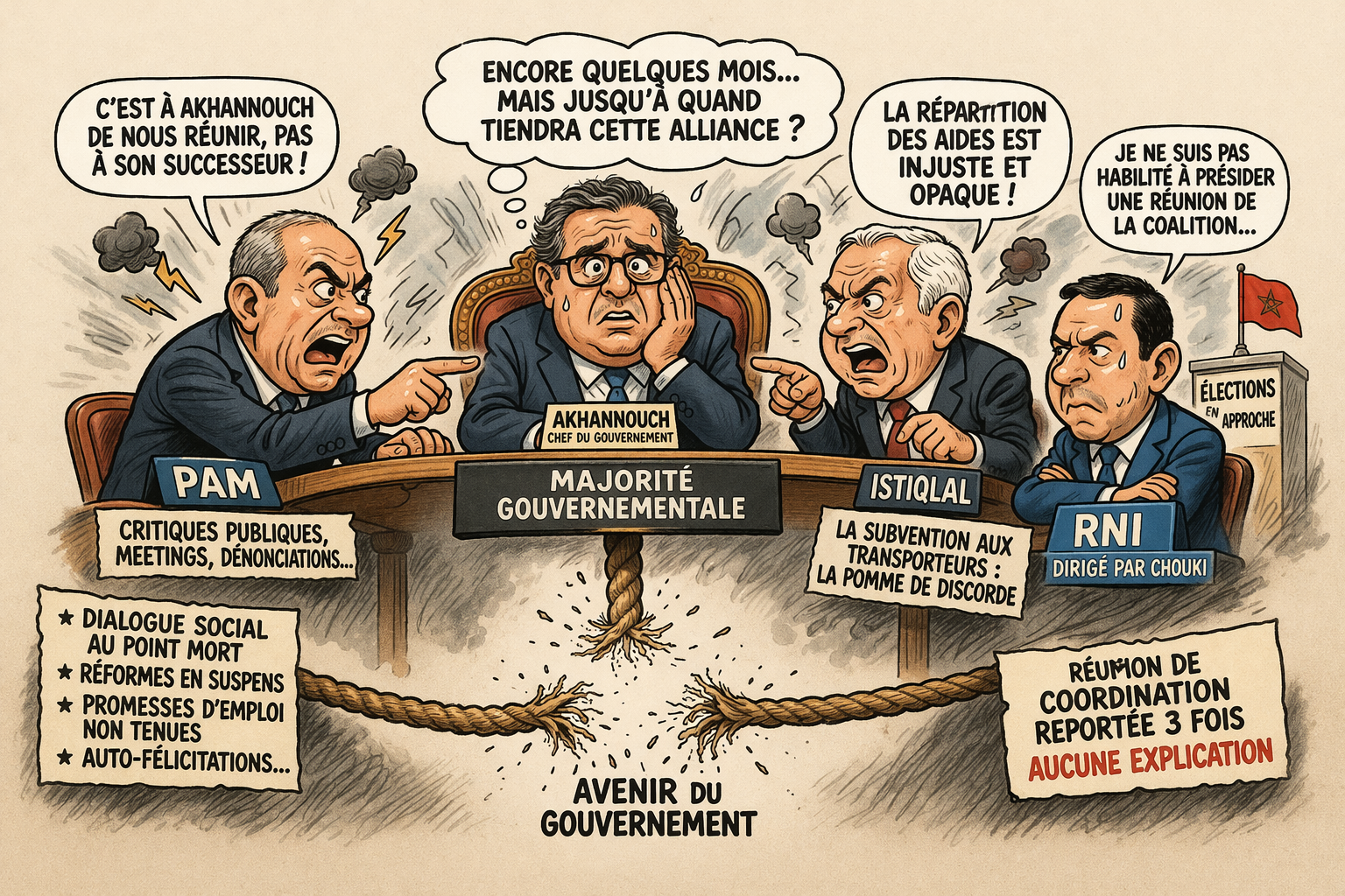 Pour couronner le tout, le PAM et l’Istiqlal ne cessent de répéter, à qui veut les entendre, que c’est à Akhannouch, chef du gouvernement “intuitu personae”, de réunir les trois formations composant sa majorité gouvernementale, et non à son successeur, Chouki, récemment élu à la tête du RNI, de le faire, celui-ci n’étant pas habilité à présider une telle réunion de coordination essentielle à la bonne gestion des affaires de la nation.